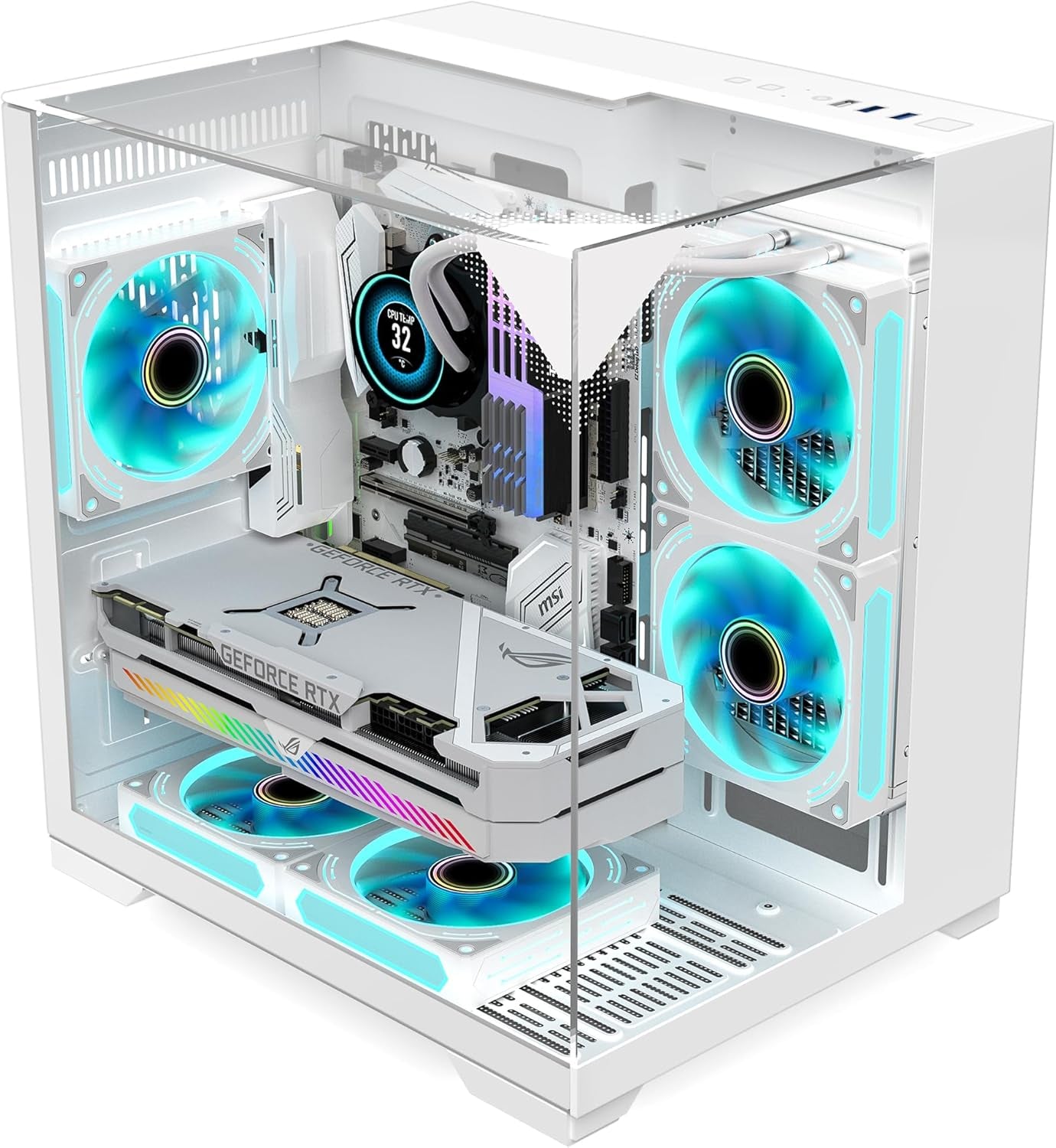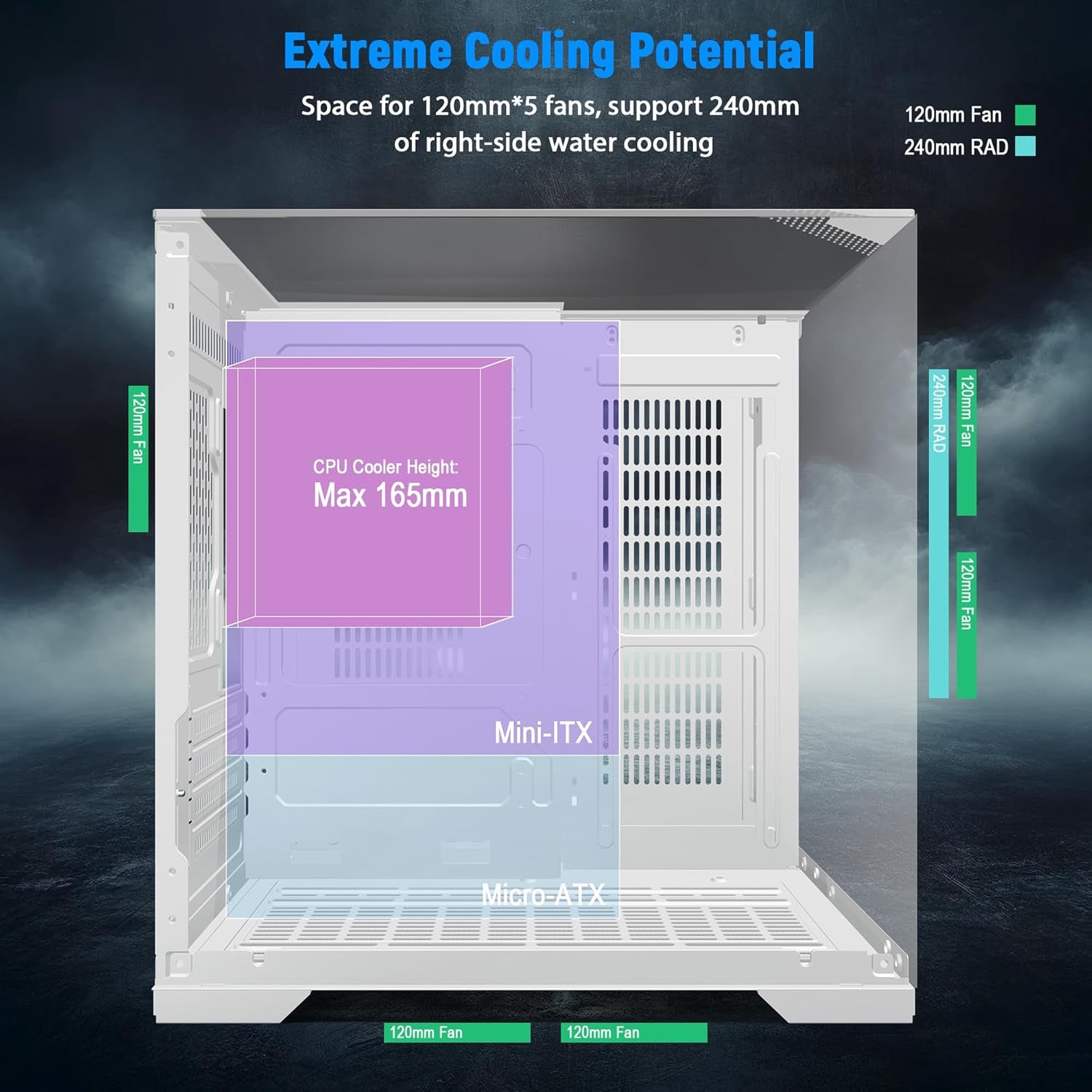 La GOPIE T03 es una caja de computadora en formato mini torre, diseñada para entusiastas del gaming y constructores de PC que buscan una combinación de estética y funcionalidad. Su diseño de tres paneles de vidrio templado panorámico ofrece una vista de 270° de los componentes internos, permitiendo exhibir su configuración con estilo. El diseño de doble cámara separa los cables, el almacenamiento y la fuente de alimentación de otros componentes, manteniendo una apariencia limpia y optimizando el flujo de aire hacia la GPU. Es compatible con placas base Mini-ITX y admite radiadores de hasta 240 mm, brindando flexibilidad para configuraciones de refrigeración líquida. Tenga en cuenta que los ventiladores no están incluidos.