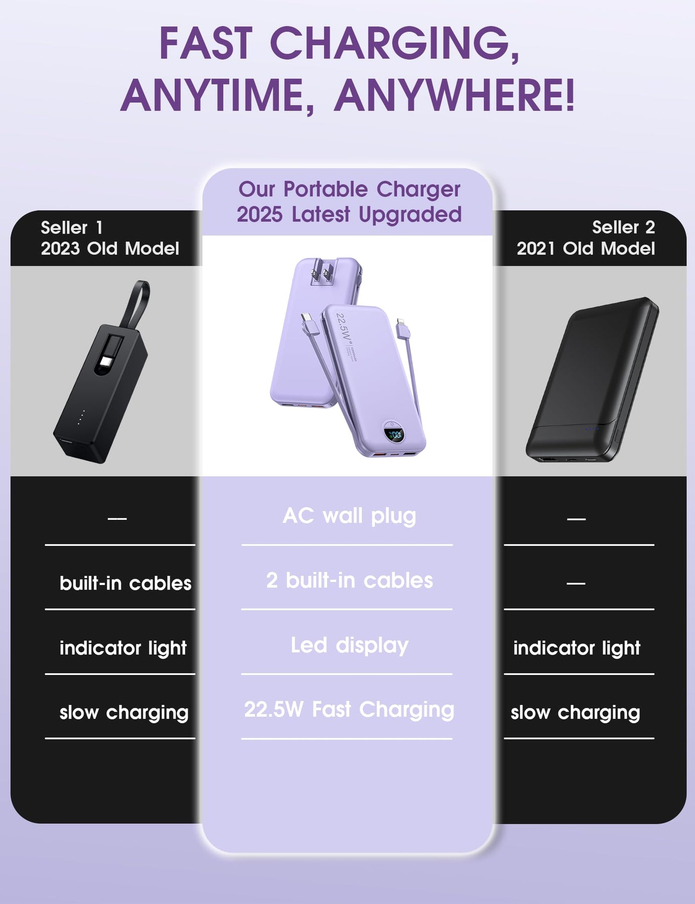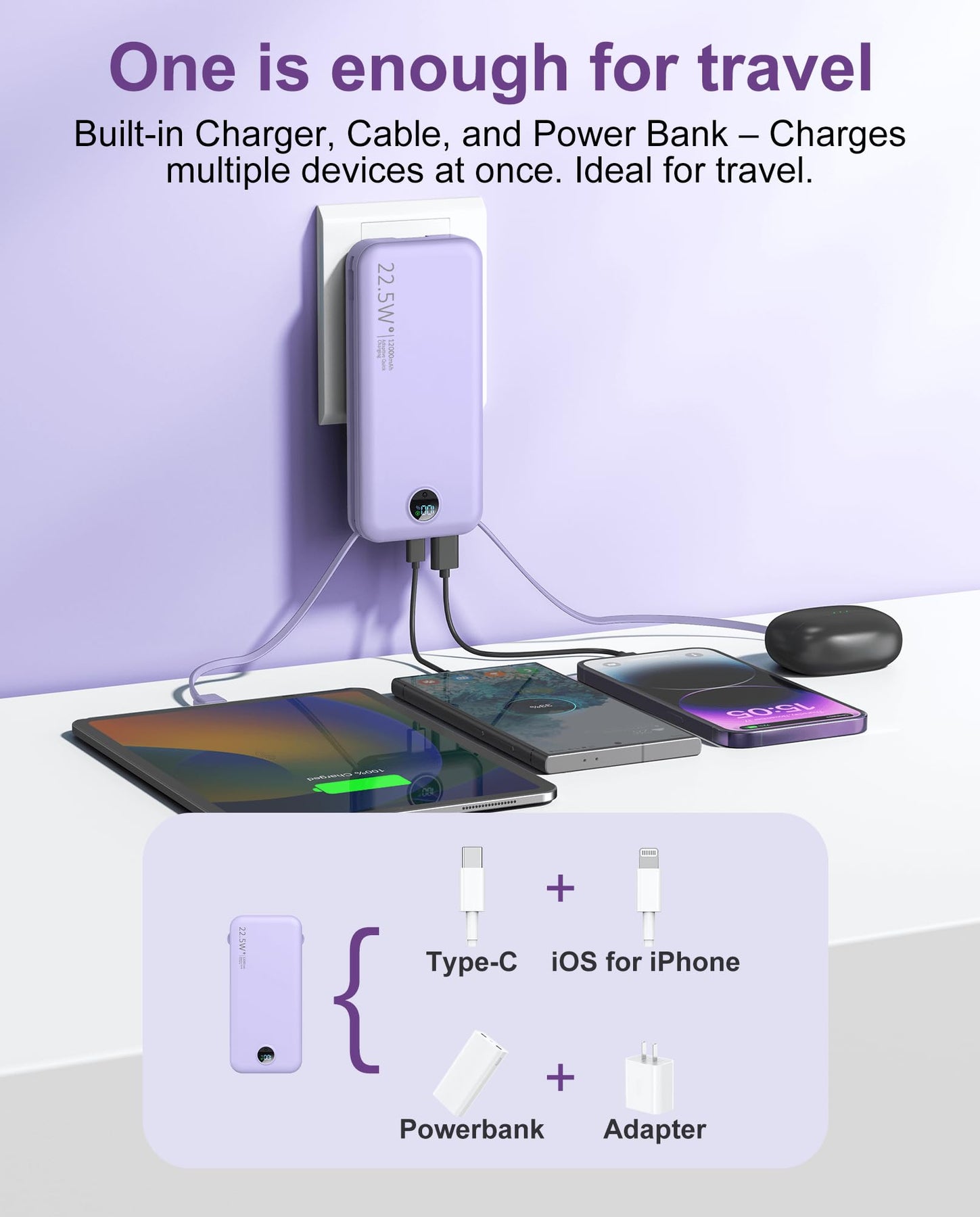 El Citicr Power Bank 12000 mAh 22.5W combina potencia y practicidad con cables integrados, pantalla LED inteligente y enchufe AC plegable. Ofrece carga rápida USB-C de 22.5W, ideal para mantener tu iPhone, Samsung o iPad siempre con energía durante viajes o jornadas largas.
