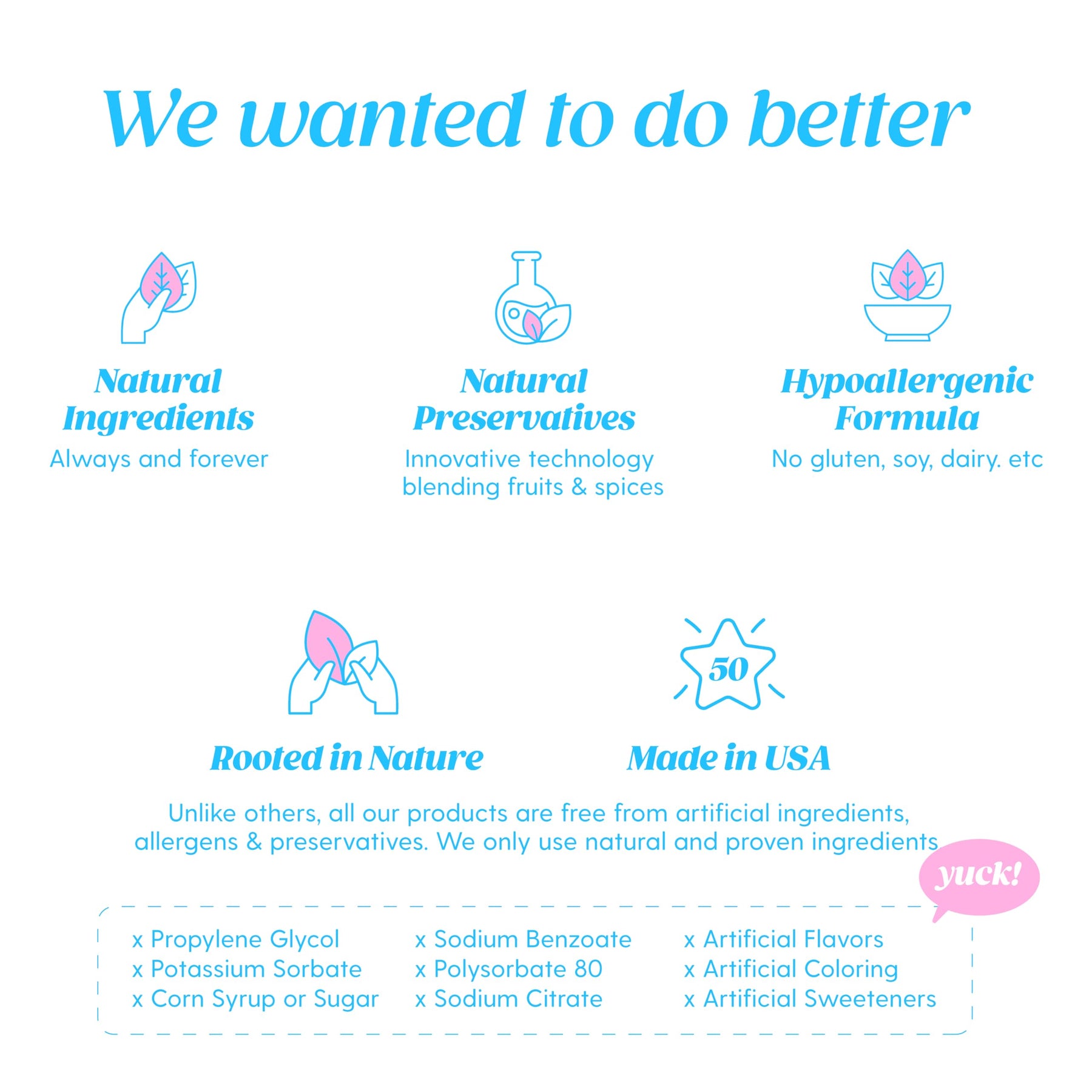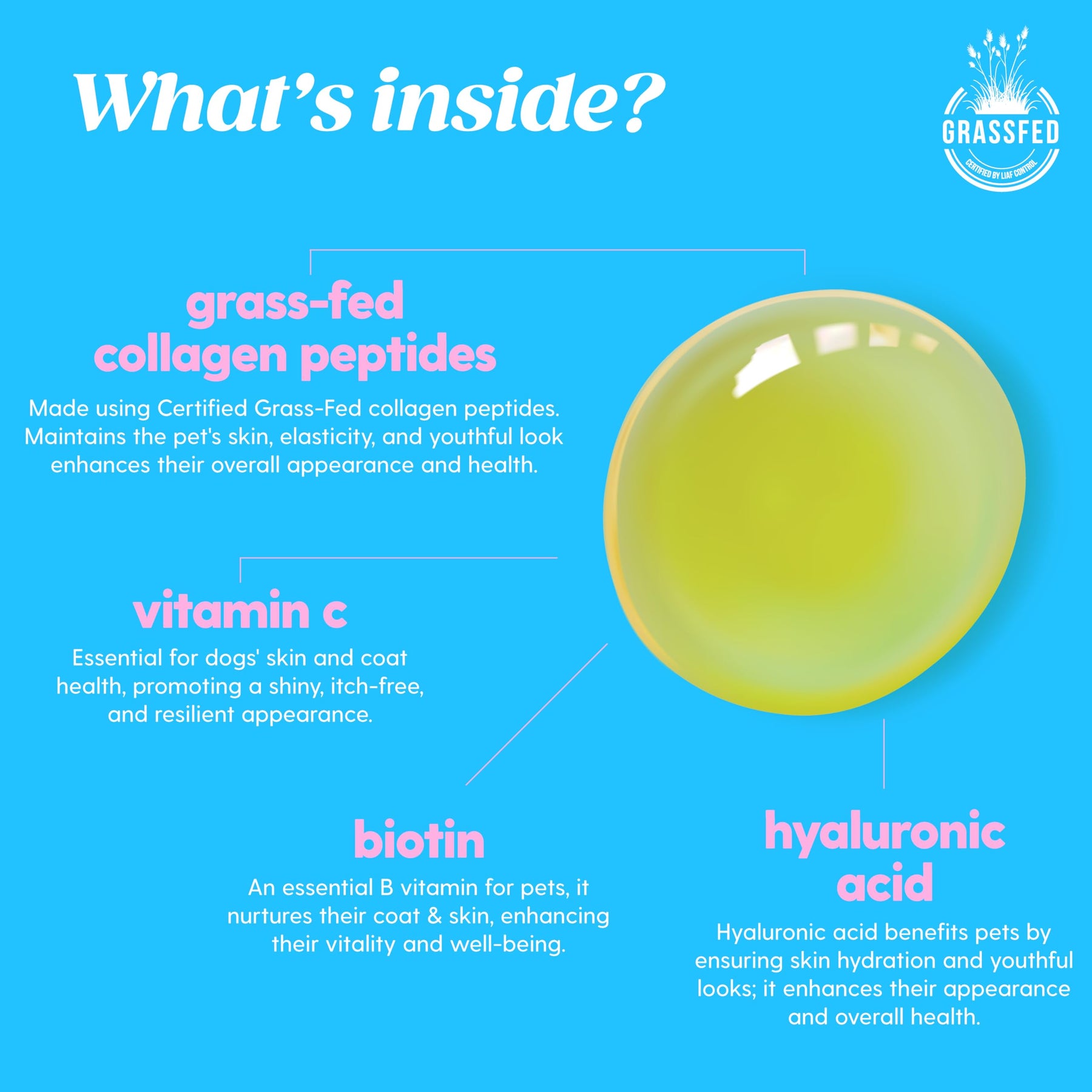 Colágeno hidrolizado alimentado con pasto, biotina, vitamina C, ácido hialurónico, agua purificada y extractos naturales. Libre de colorantes, gluten y conservantes artificiales.
