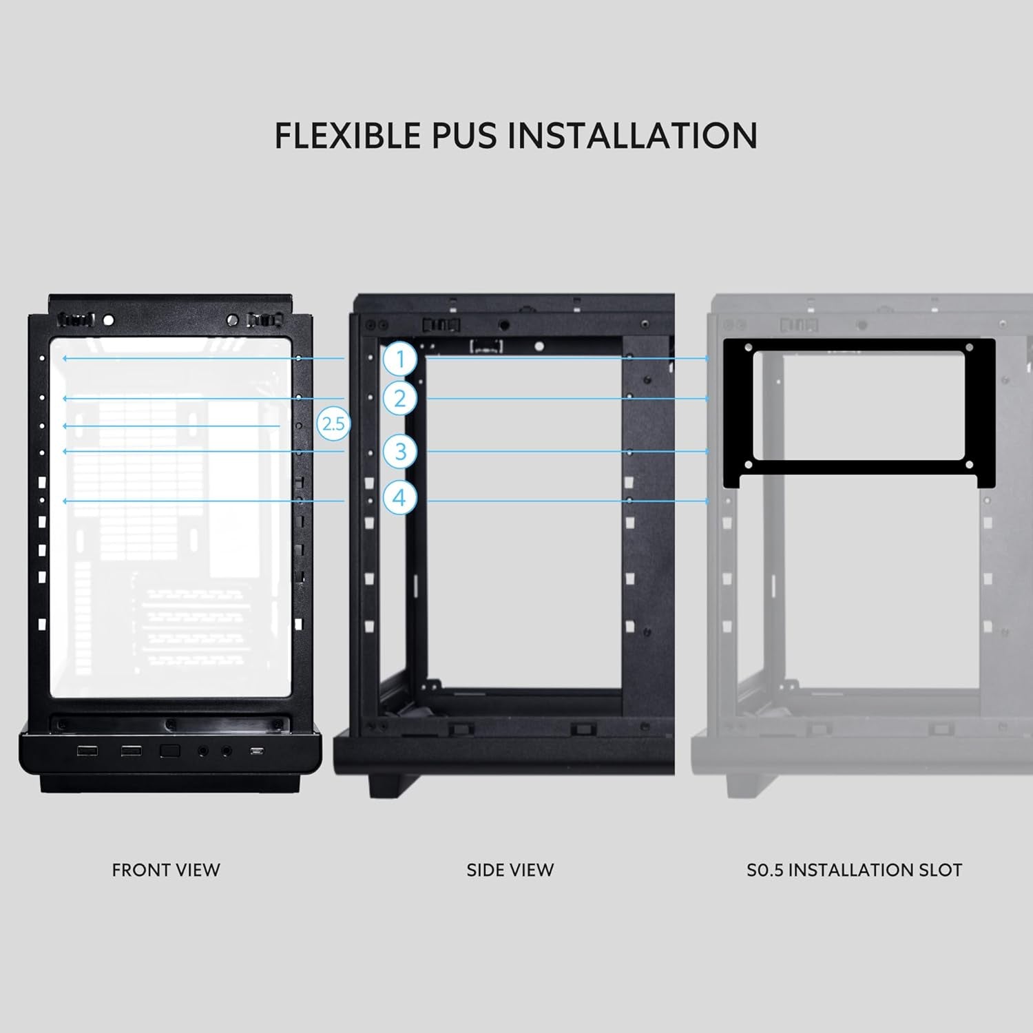 Soporte flexible para fuentes de alimentación ATX, SFX y SFX-L, instalación adaptable según las necesidades del sistema.