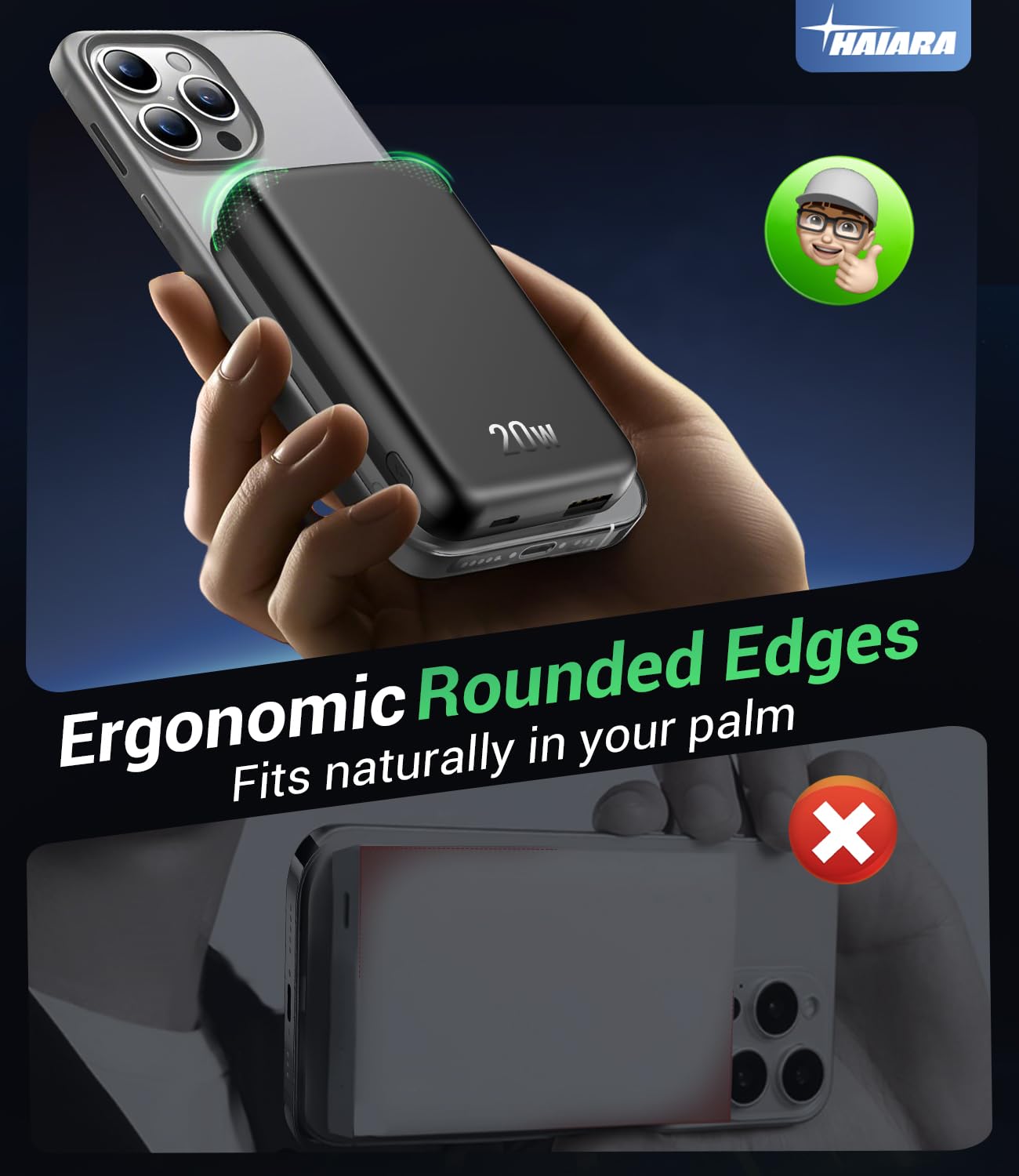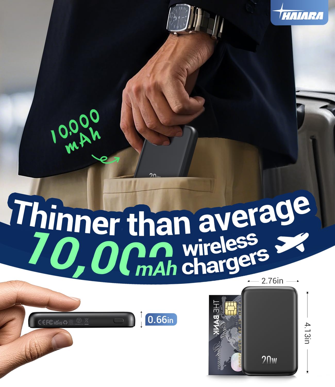 El HAIARA MagSafe Power Bank 10000 mAh combina carga inalámbrica magnética rápida de 20 W con puerto USB-C y diseño slim ultraligero. Compatible con iPhone 13 al 17, es ideal para viajes, oficina o uso diario.