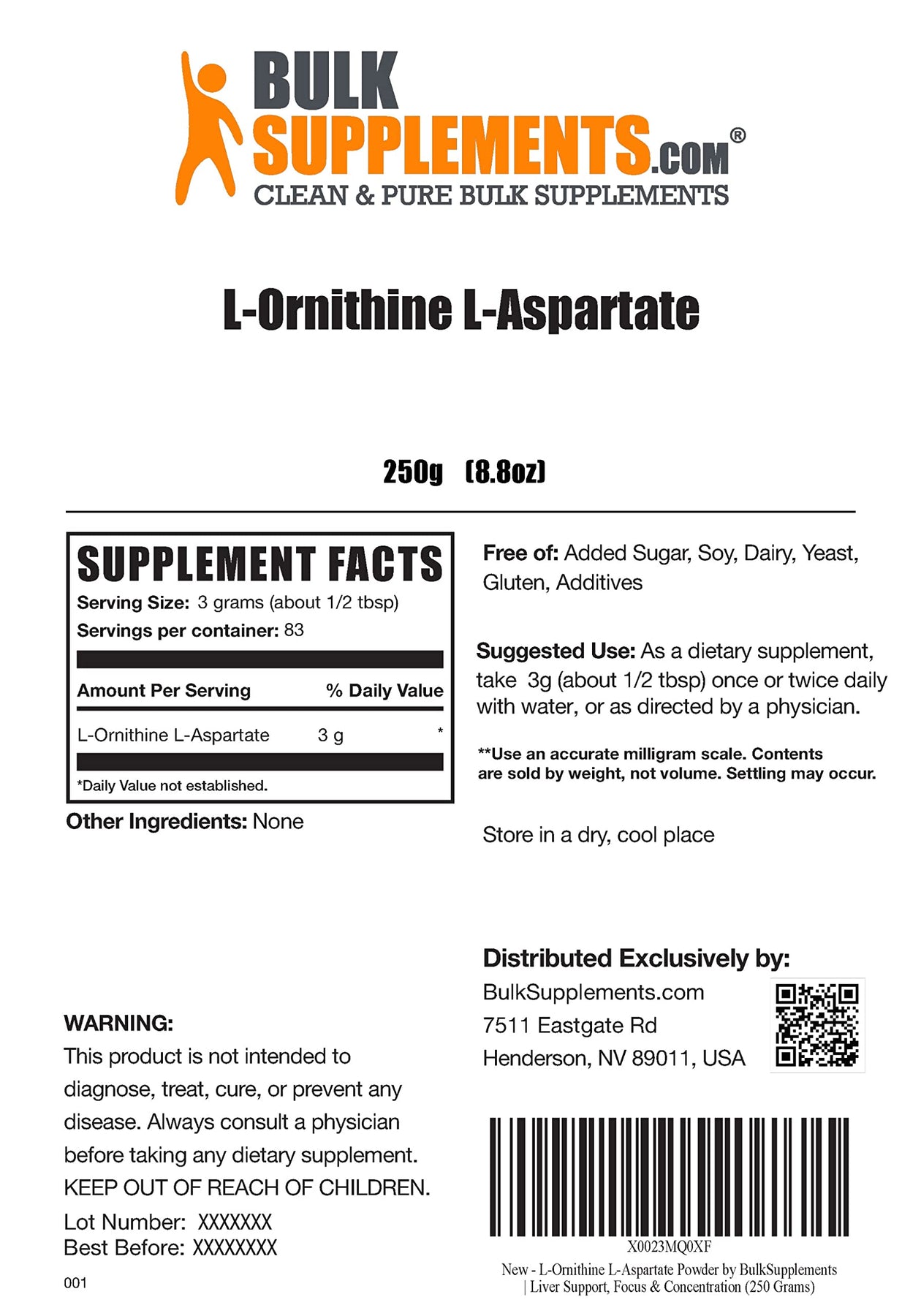 Polvo puro de L-ornitina / L-aspartato con 3 g por porción. Fórmula sin sabor, libre de gluten y producida bajo estándares cGMP.