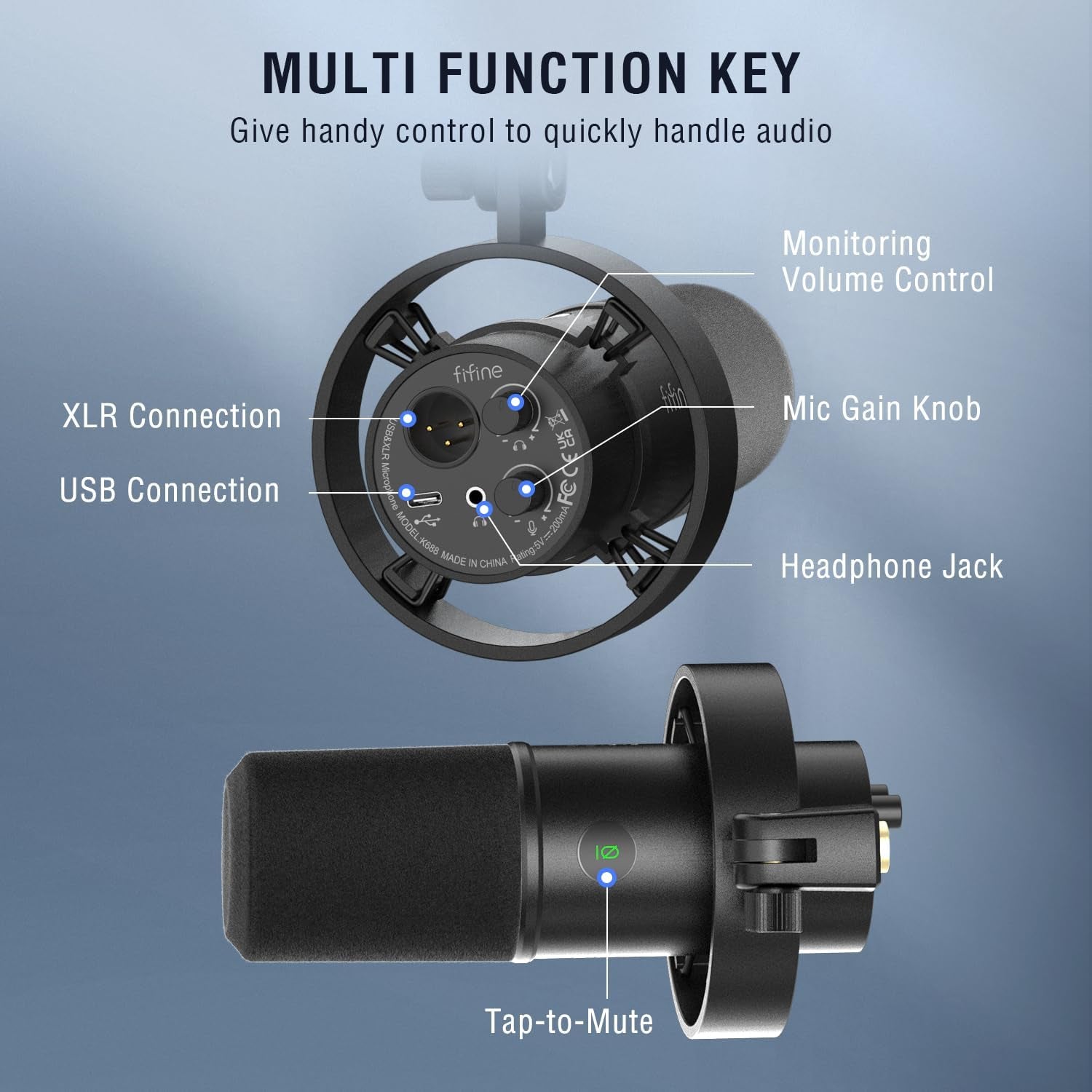 Lleva tu producción al siguiente nivel con el micrófono dinámico FIFINE K688T, un set completo que combina calidad de estudio y facilidad de uso. Con doble salida USB/XLR, brazo articulado de alta resistencia, botón de mute táctil y salida de audífonos con control de monitoreo, este micrófono ofrece todo lo necesario para grabar, transmitir o hacer podcast con un sonido limpio, potente y sin latencia.