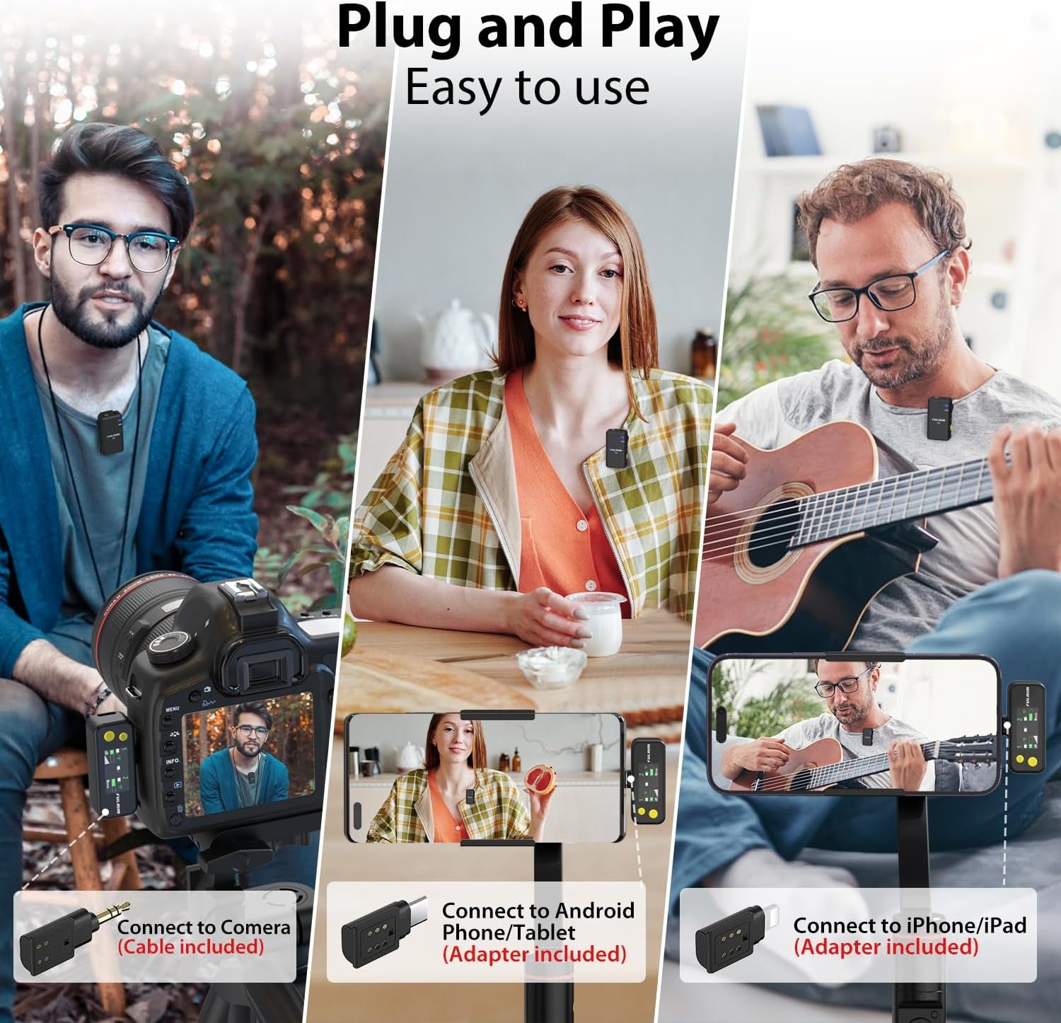 Compatible con cámaras DSLR, iPhone y Android, este sistema plug & play es fácil de usar y no requiere configuraciones complejas. Cuenta con cancelación de ruido incorporada, lo que permite una captura de voz clara y sin interferencias en cualquier entorno, incluso en exteriores. Su diseño moderno y liviano lo hace cómodo para usar sobre la ropa con clips discretos.