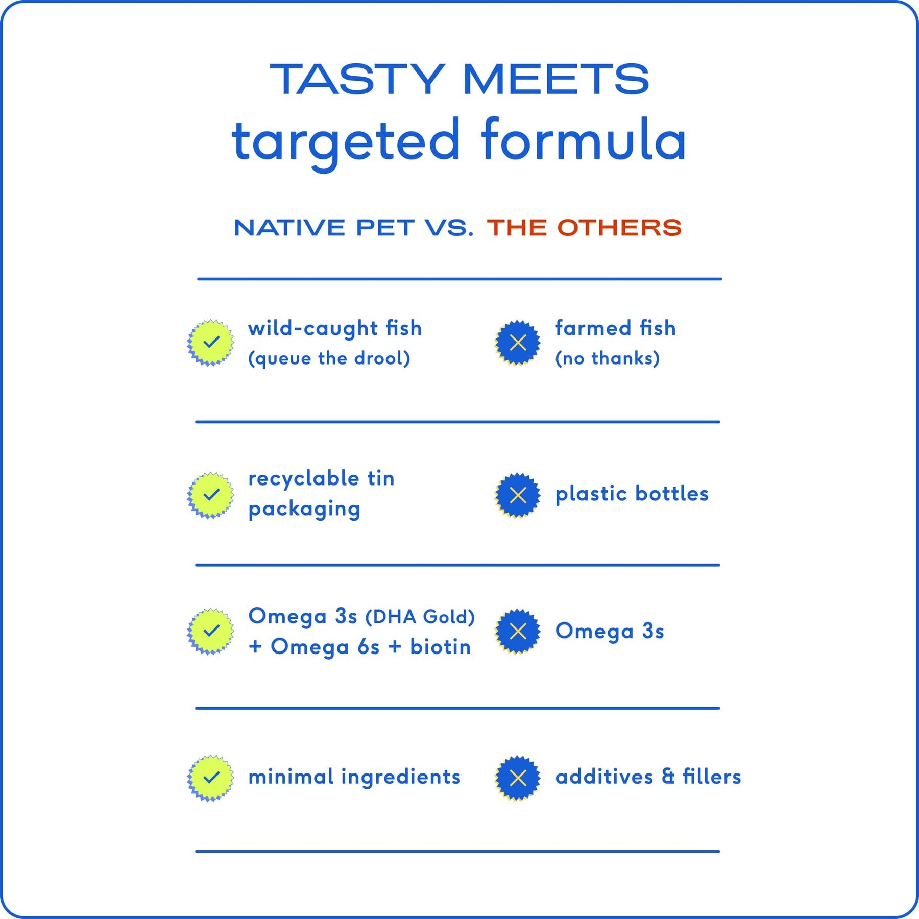 Aceite de pescado salvaje (salmón y abadejo de Alaska), Aceite de girasol, Aceite de linaza, Mezcla de tocoferoles naturales, Ácidos grasos Omega 3 (EPA, DHA), Omega 6 y Omega 9.
