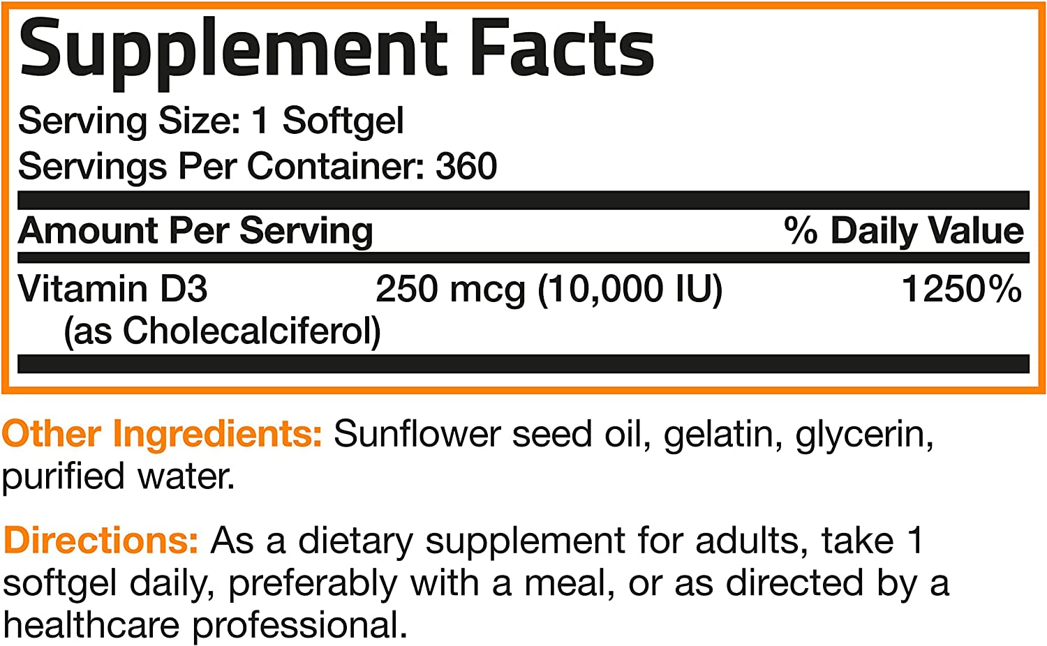 • 10,000 UI (250 mcg) de vitamina D3 por cápsula: Proporciona una dosis potente para satisfacer tus necesidades diarias.