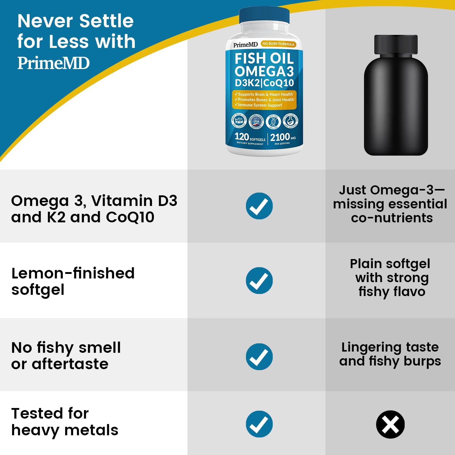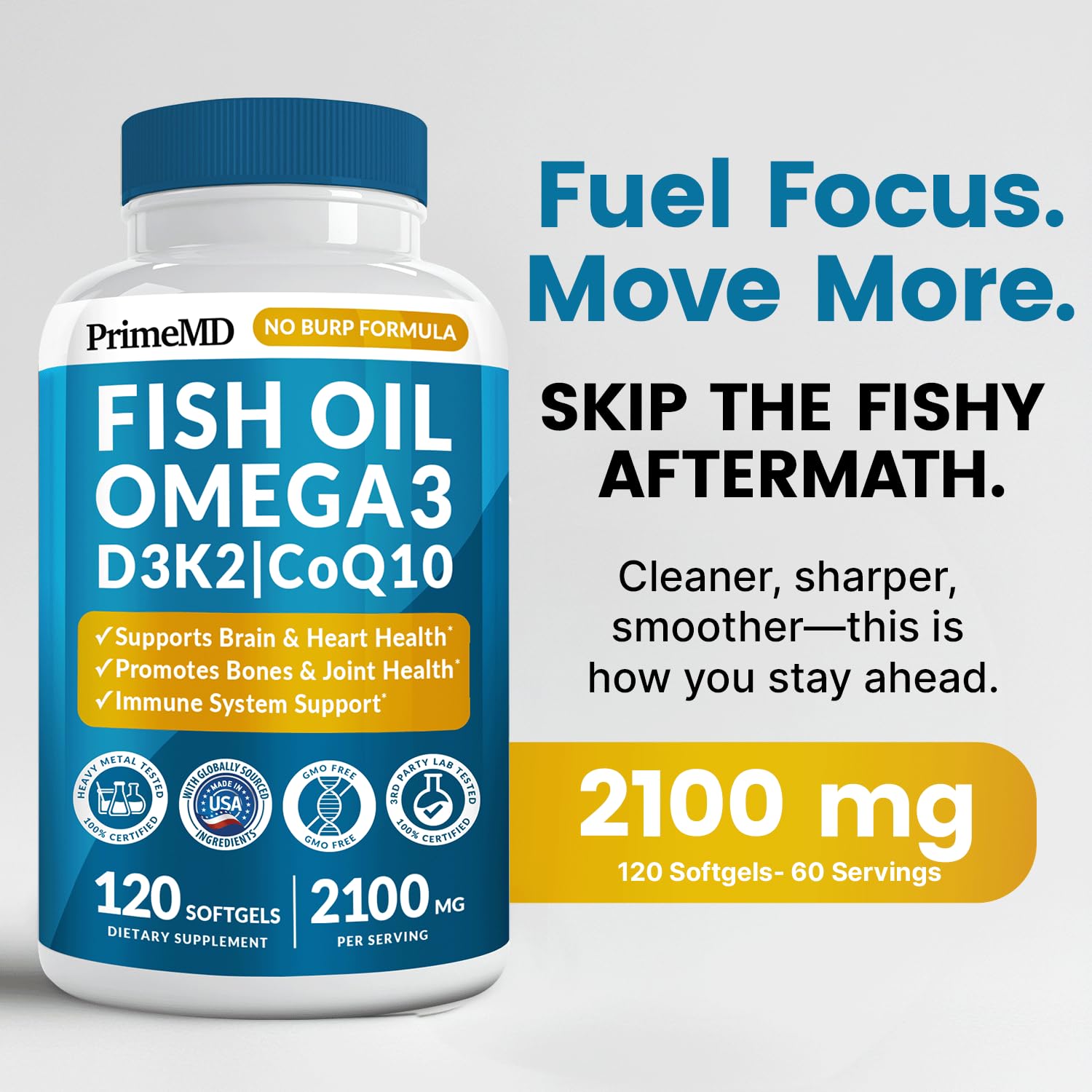El suplemento de aceite de pescado “5-en-1” de PrimeMD combina omega-3 en triglicéridos (EPA/DHA), coenzima Q10 (CoQ10) y vitaminas D3 y K2 en cápsulas blandas con sabor limón. Formulado para integrarse de forma limpia a tu rutina diaria de bienestar, esta presentación de 120 unidades proporciona un aporte programado para aproximadamente 60 días (2 cápsulas al día). Sin gluten, sin lácteos y con prueba de metales pesados por terceros. Ideal para quienes buscan una mezcla completa de ácidos grasos esenciales y vitaminas liposolubles de calidad premium.