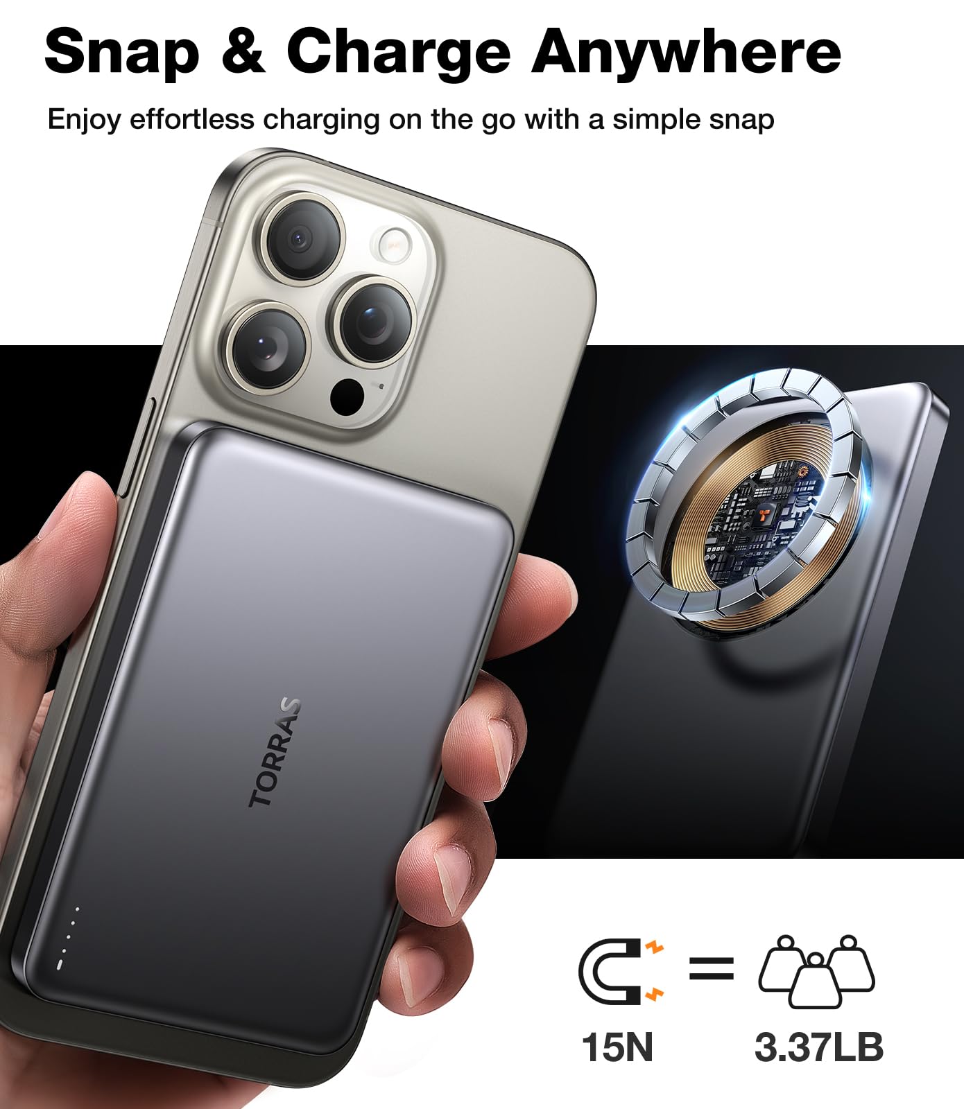 Cargador magnético TORRAS MiniMag 10000mAh, el último banco de energía portátil delgado y duradero. Compatible con iPhone 16 Pro Max / iPhone 16 Pro / iPhone 16 Plus / iPhone 16 / iPhone 15 Pro Max / iPhone 14 Pro Max / iPhone 13 / iPhone 12, AirPods Pro 1/2/3, Samsung Galaxy S24 Ultra / S24 / S24 Plus / S23 Ultra, iPad Pro / mini y más. Con carga inalámbrica magnética segura a baja temperatura, carga por cable de 22,5 W y un modo de baja corriente para auriculares Apple. Con su diseño ultrafino, se adapta perfectamente a la mano y ofrece una potente atracción magnética de 15N. Experimenta una carga rápida, portátil y fiable vayas donde vayas.
